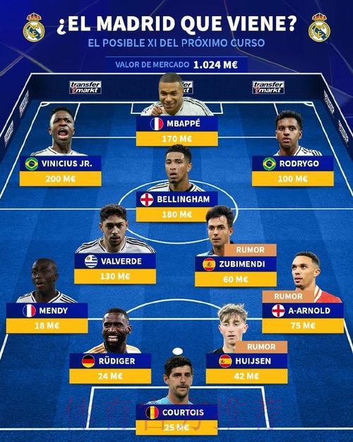 姆巴佩登陆伯纳乌后 皇马会变成一支什么样的球队 当德转给出“皇马下赛季潜在首发11人:姆巴佩&贝林领衔”这份想象清单时 球迷的第一反应往往不是战术板上的箭头 而是关于时代更迭的直觉 —— 这支曾
